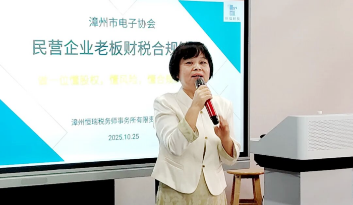 10月25日,漳州市电子协会举办“财税合规+直播间搭建”主题分享交流会,漳州恒瑞税务师事务所所长王素洪受邀为该协会会员企业开展财税合规培训。